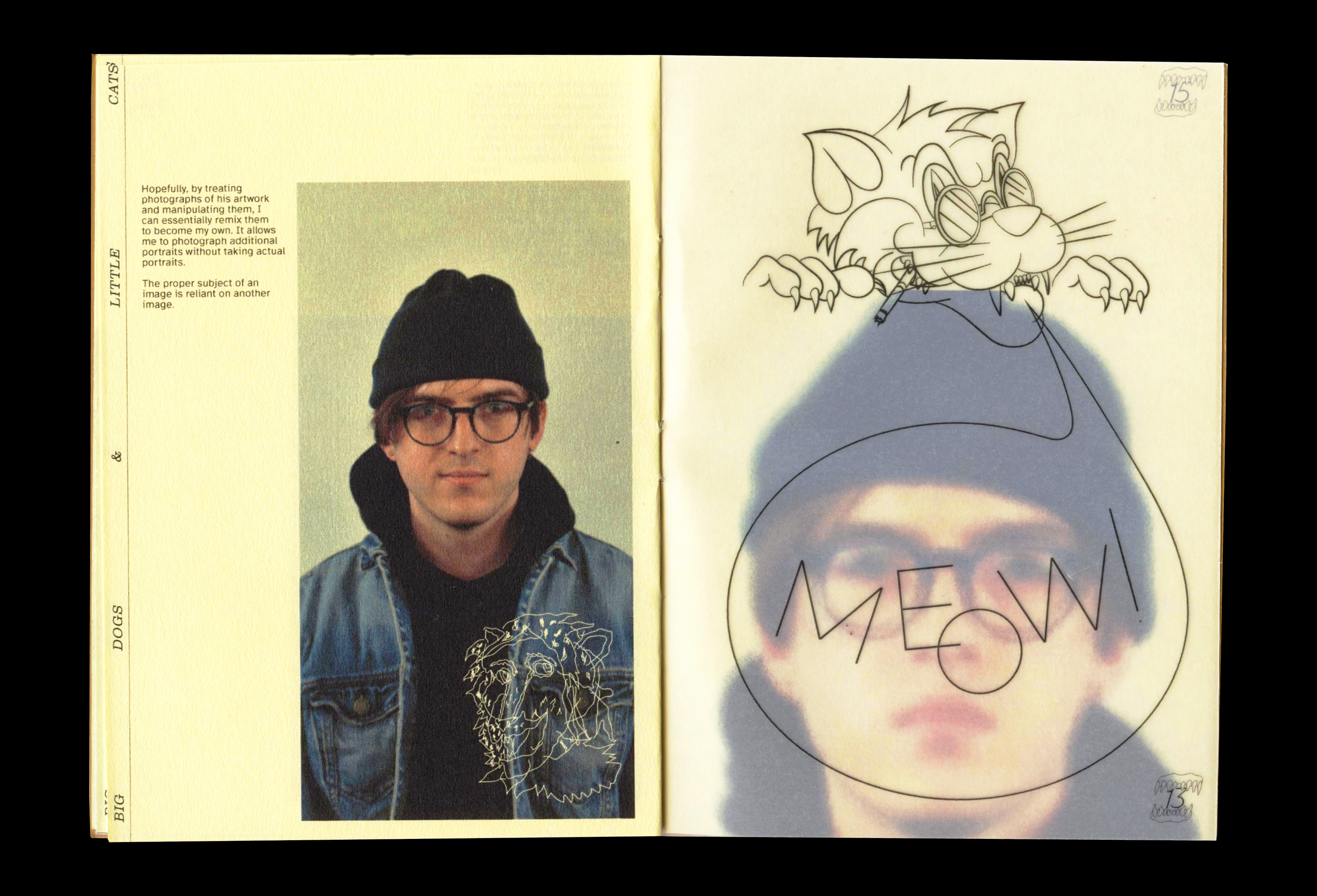 Big Dogs & Little Cats is a series of miniature zines based on personal conversations with my autistic older brother, Forrest. It includes two booklets bound by transparent vellum and construction paper, containing various illustrations, photographs, and custom stickers.